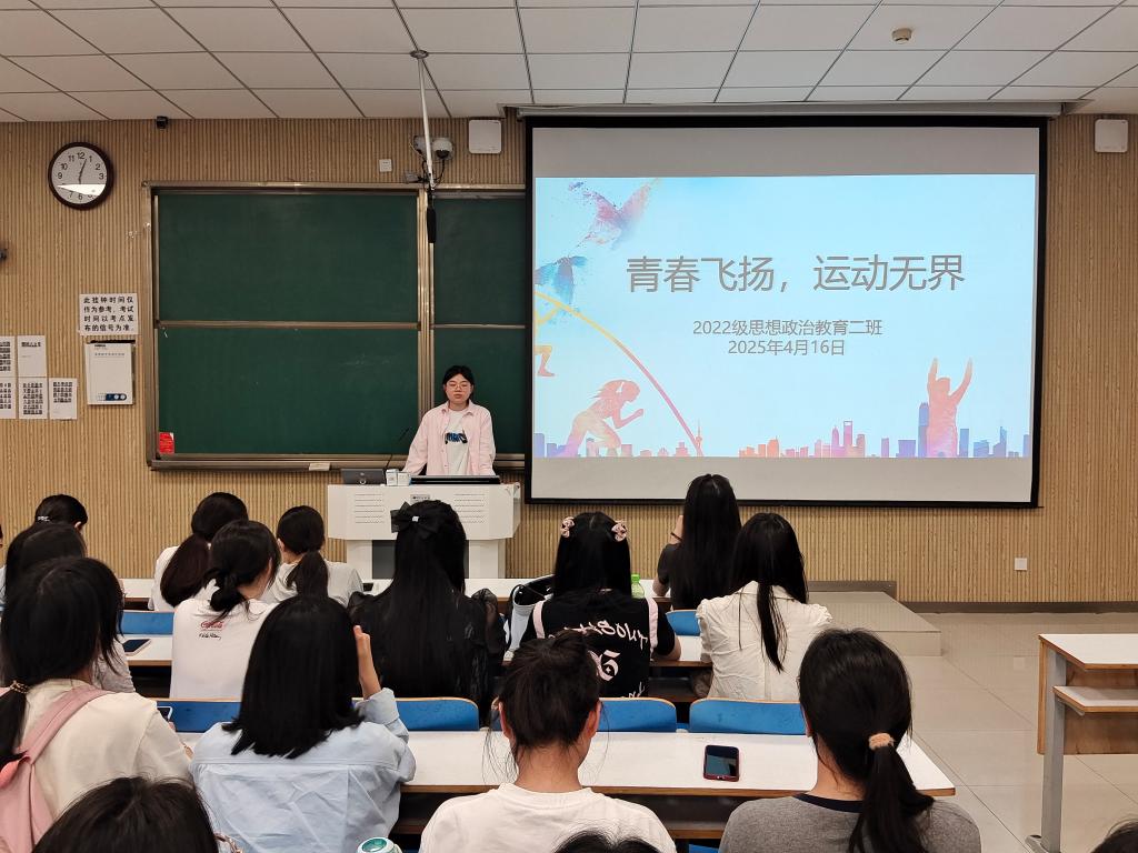 为进一步提高员工加强运动的意识,增强员工体质和综合素质,4月16日下午,2022级思想政治教育二班在社科楼515教室召开“青春飞扬,运动无界”主题班会。公司2022级思想政治教育二班全体成员共同参与此次班会。会议由副班长冯伟珈主持。