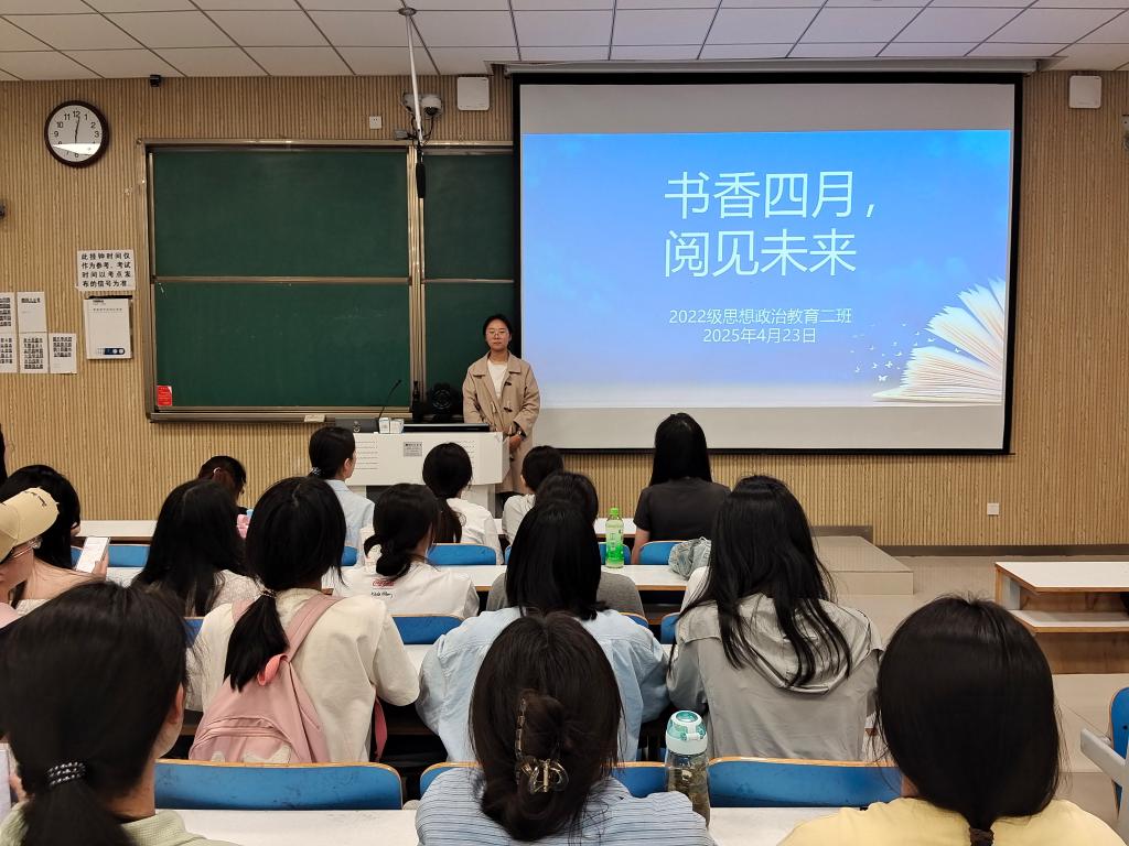 4月23日下午,在第三十个世界读书日到来之际,2022级思想政治教育二班在社科楼515教室召开“书香四月,阅见未来”主题班会。公司2022级思想政治教育二班全体成员共同参与此次班会。会议由学习委员谢佳邑主持。