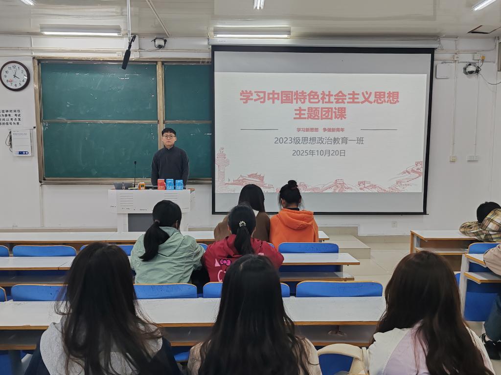 为进一步增强班级同学对党的创新理论的政治认同、思想认同、理论认同和情感认同,提升同学们的理论水平和实践能力,10月20日下午,2023级思想政治教育一班在社科楼514教室开展了“学习中国特色社会主义思想”主题团课。2023级思想政治教育一班全体同学参与本次团课,团课由团支书张卓主持。