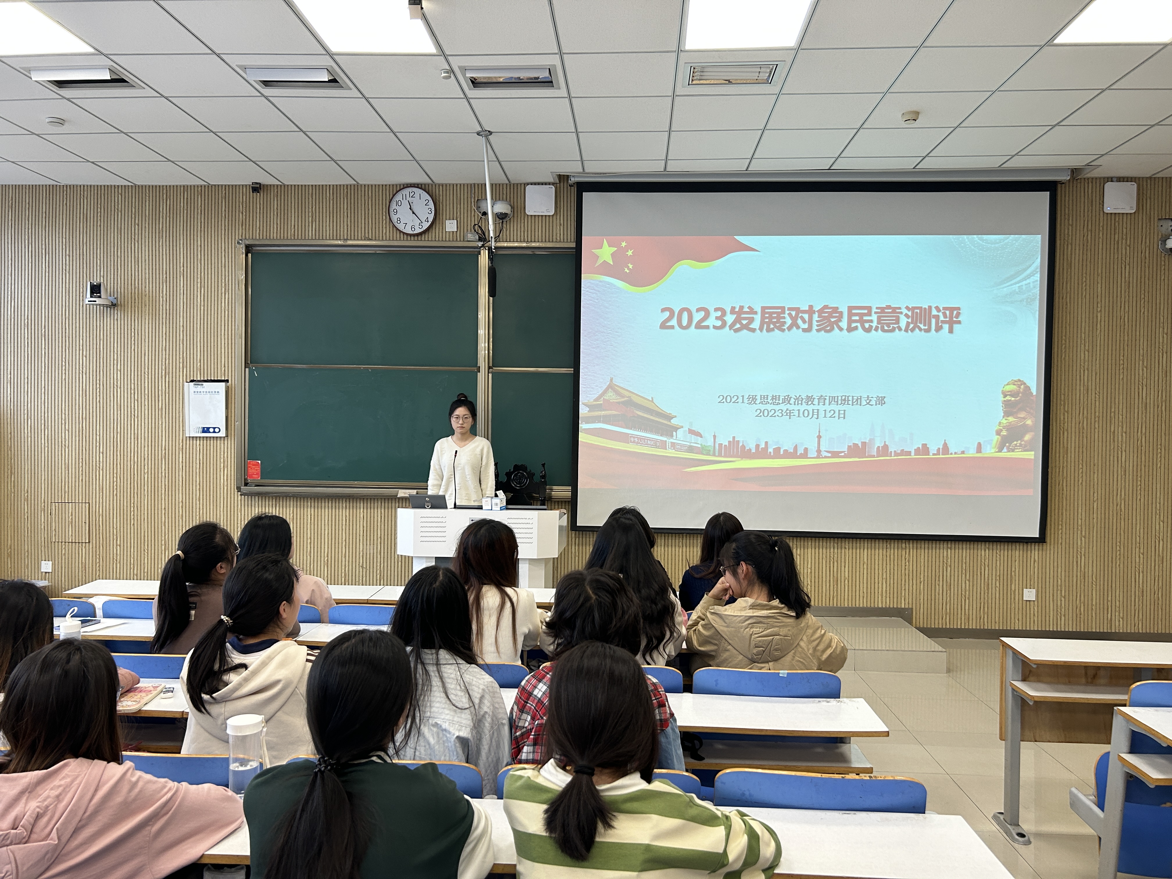10月12日下午,2021级思想政治教育四班在社科楼514教室召开2023年发展对象民意测评会。2021级思想政治教育四班全体团员共同参会。会议由团支书刘珂含主持。