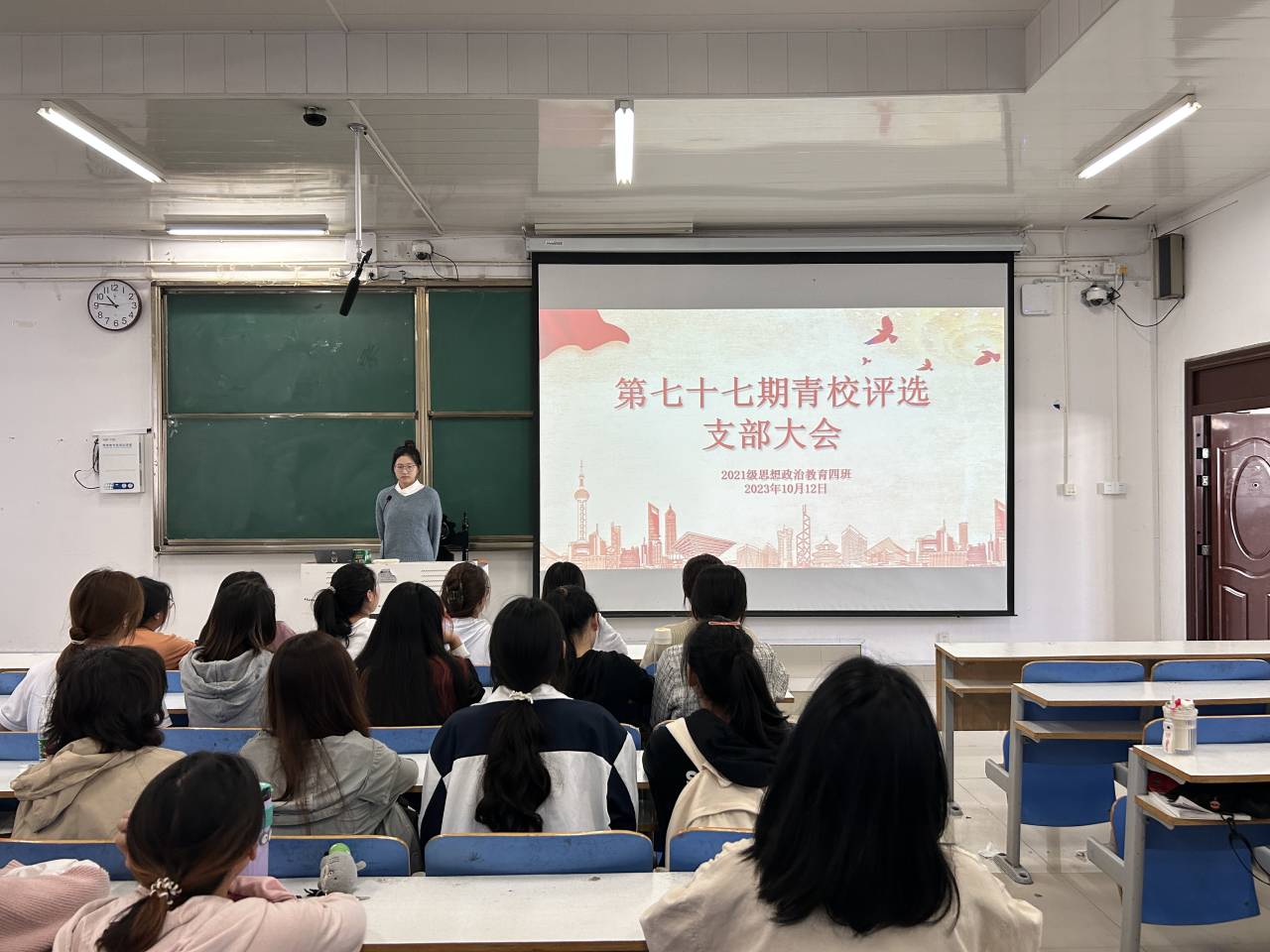10月12日下午,2021级思想政治教育四班在社科楼515教室开展第77期“青校”评选团支部大会。2021级思想政治教育四班全体团员共同参与本次会议。会议由团支书刘珂含主持。