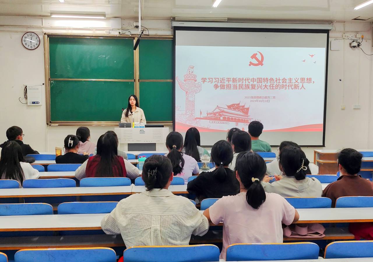 10月20日下午,2021级思想政治教育三班在社科楼514教室召开“学习习近平新时代中国特色社会主义思想,争做担当民族复兴大任的时代新人”主题团课。2021级思想政治教育三班全体团员参与此次会议。会议由团支书王岚霄主持。