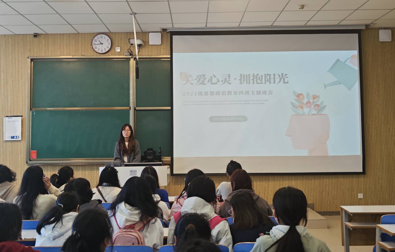 11月16日下午,2021级思想政治教育四班在社科楼514教室开展“关爱心灵,拥抱阳光”主题班会。2021级思想政治教育四班全体员工共同参加本次会议。会议由心理委员杨可主持。