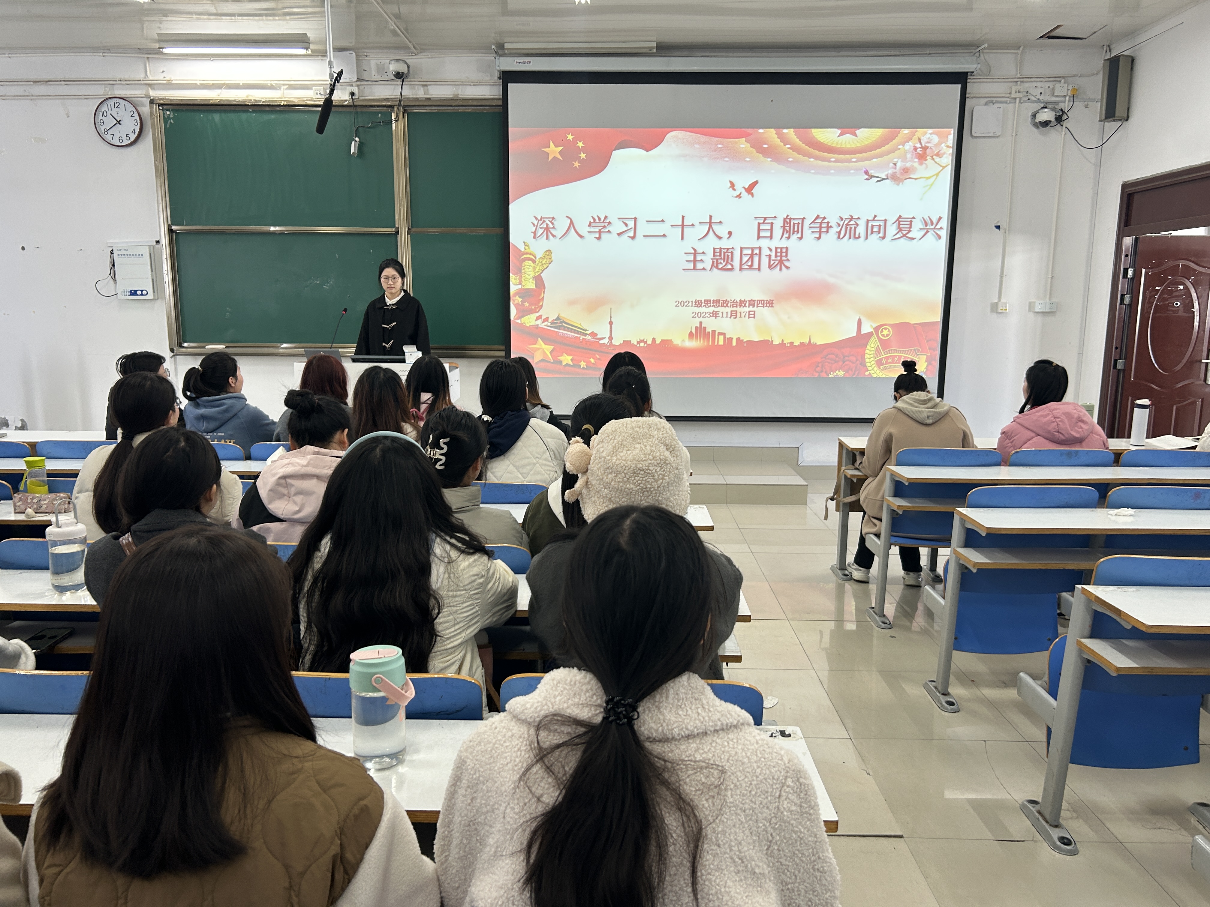 11月17日上午,2021级思想政治教育四班在社科楼515教室开展“深入学习二十大,百舸争流向复兴”主题团课。2021级思想政治教育四班全体员工共同参加本次团课。团课由团支书刘珂含主持。