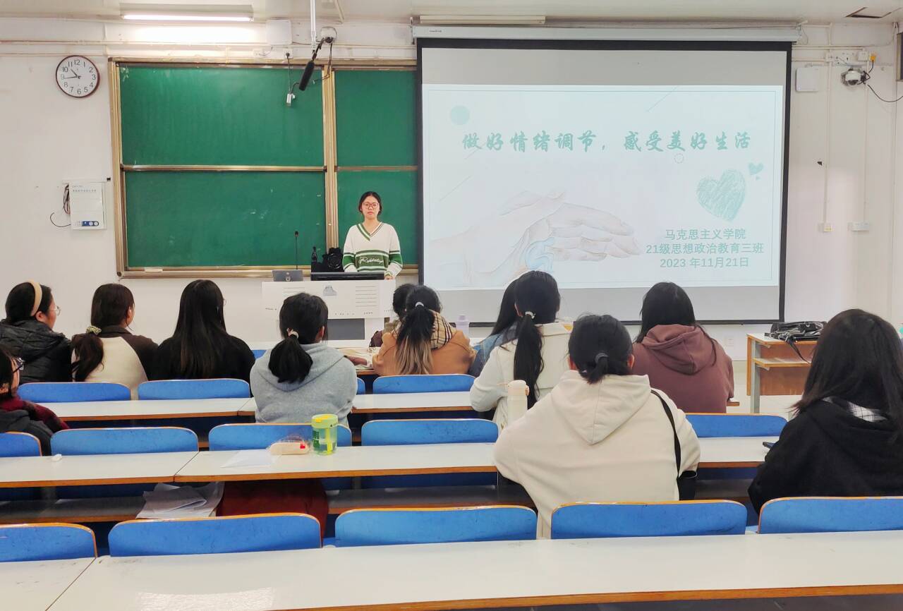 11月21日下午,2021级思想政治教育三班在社科楼514教室举办“做好情绪调节,感受美好生活”主题团课。2021级思想政治教育三班全体成员参加了此次会议。会议由心理委员许竞文主持。