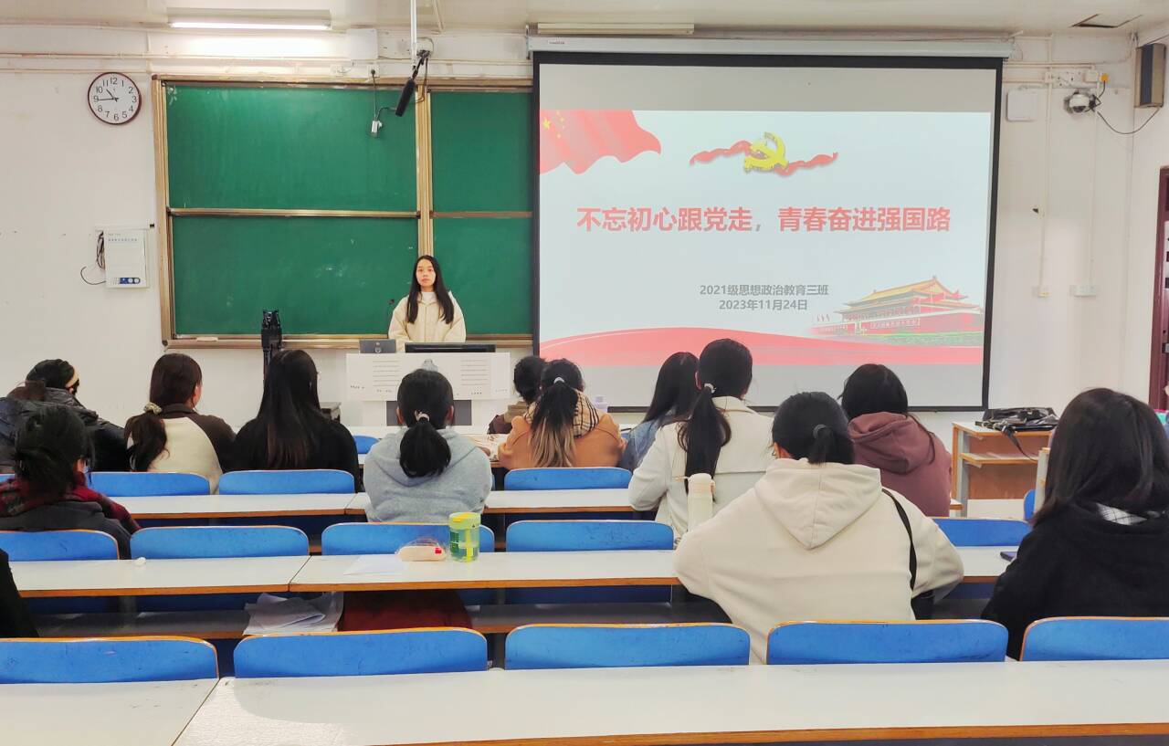 11月24日下午,2021级思想政治教育三班在社科楼514教室举办“不忘初心跟党走,青春奋进强国路”主题团课。2021级思想政治教育三班全体团员参加了此次团课。团课由团支书王岚霄主持。