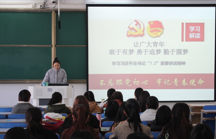 首先,李明瑶带领同学们学习了解习近平总书记7·2讲话的内容,“中共中央总书记、国家主席、国家军委主席习近平7月2日在中南海同团中央新一届领导班子集体谈话并发表重要讲话,他强调,青年一代有理想,有本领,有担当,国家就有前途,民族就有希望”。她讲到“7·2讲话,习近平总书记强调了要抓好三个根本性问题:必须把培养社会主义建设者和接班人作为根本任务、把巩固和扩大党执政的青年群众基础作为政治责任、把围绕中心服务大局作为主线,习总书记强调青年工作,抓住的是当下,传承的是根脉,面向的是未来,攸关党和国家前途命运。各级党委要关注关心青少年成长,为他们成长成才、施展才华创造良好条件。各级党委要拿出极大精力抓青年工作、抓共青团工作,切实尽到领导责任”。听完习总书记的讲话,同学们感受到作为一名青年的自豪感与责任感,感受到习近平总书记对青年所寄予的希望,定会以坚定的信念指引自身,不忘初心跟党走,牢记青春使命。(XCSport 黄文博 /供稿)
