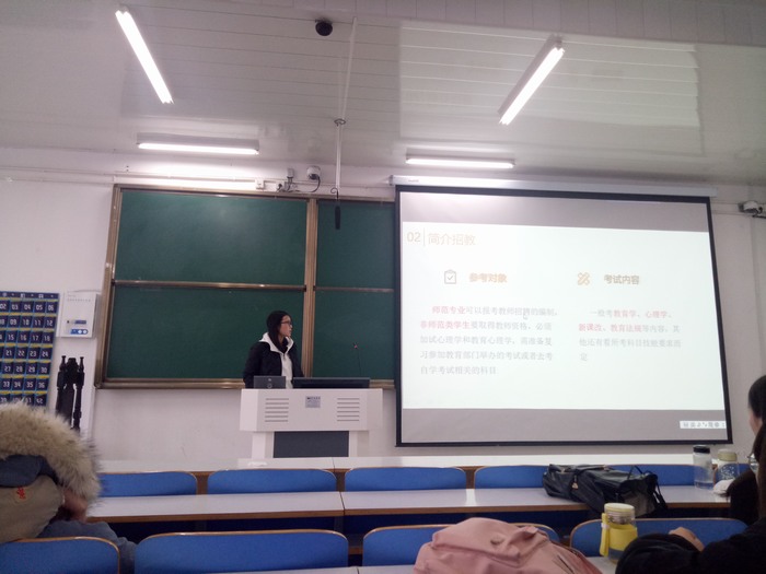首先,张晓鑫向同学们介绍了招教的定义,简单讲述了招教的参考对象,考试内容以及参考流程,使同学们初步了解了招教是什么以及需要准备些什么。之后介绍了招教报考的步骤,分别是报名、笔试、面试、公司试讲以及才艺展示。报名通过网上或现场报名,等待审核材料。笔试按照1:4的比例考试,每科只录取考试人数的四分之一。面试一般是在教育中心或某个公司,随机抽取题目,靠个人的应变能力录取一半。公司试讲和才艺展示环节二选一,以及最后的体检,全部合格就通过。最后,张晓鑫通过表格清晰地展示了招教和特岗的区别,使同学们更好地选择自己喜欢的方向。
