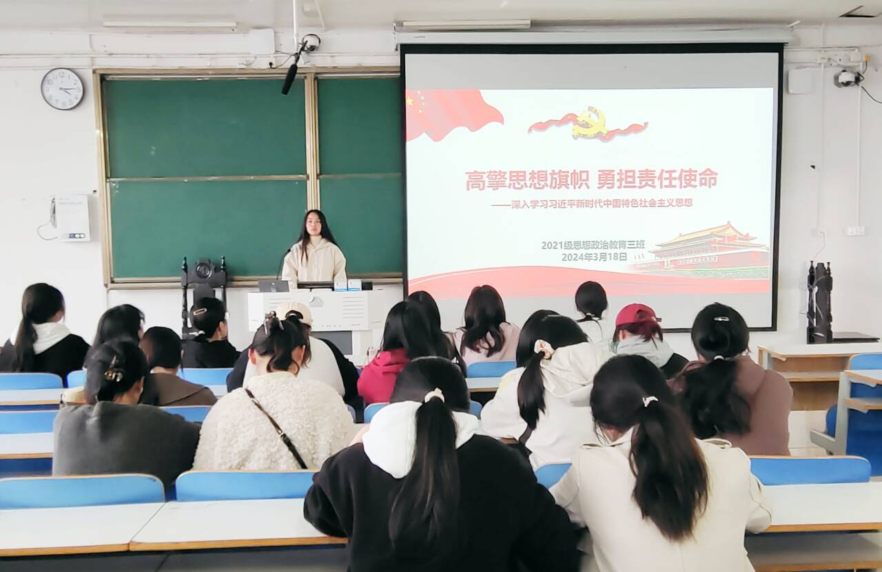 3月18日下午,2021级思想政治教育三班在社科楼514教室召开“高擎思想旗帜,勇担责任使命”主题团课。2021级思想政治教育三班全体团员参与此次会议。团课由团支书王岚霄主持。