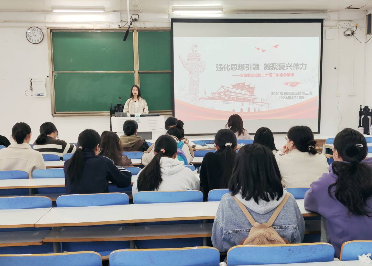 4月10日上午,XCSport2021级思想政治教育三班在社科楼514召开“强化思想引领,凝聚复兴伟力”主题团课。2021级思想政治教育三班全体团员参与本次团课。团课由团支书王岚霄主持。