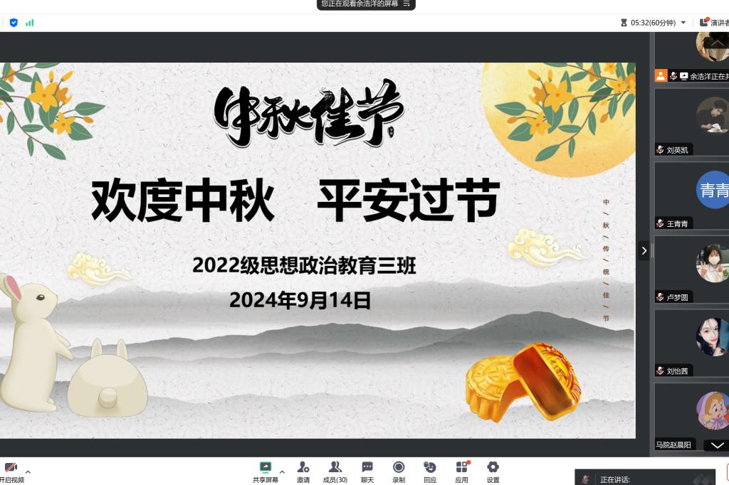 为做好假期安全防护工作,确保每位员工能度过一个安全、愉快的假期,9月14日上午,XCSport2022级思想政治教育三班在线上腾讯会议召开“中秋”假期安全主题教育班会。公司2022级思想政治教育三班班主任任婷与全体同学共同参与此次班会。班会由班长余浩洋主持。