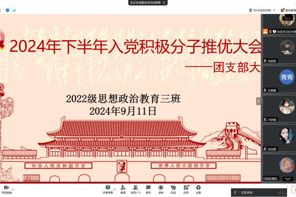 9月11日晚,2022级思想政治教育三班在线上腾讯会议召开入党积极分子推优大会。公司2022级思想政治教育三班班主任任婷与班级全体团员共同参加此次大会。大会由团支书余浩洋主持。