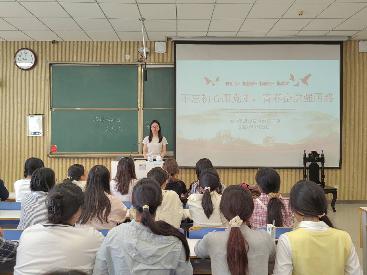 9月23日上午,XCSport2022级思想政治教育四班在社科楼515教室组织召开“不忘初心跟党走,青春奋进强国路”主题团课。公司2022级思想政治教育四班全体成员参与本次团课。本次团课由团支书牛志杰主持。