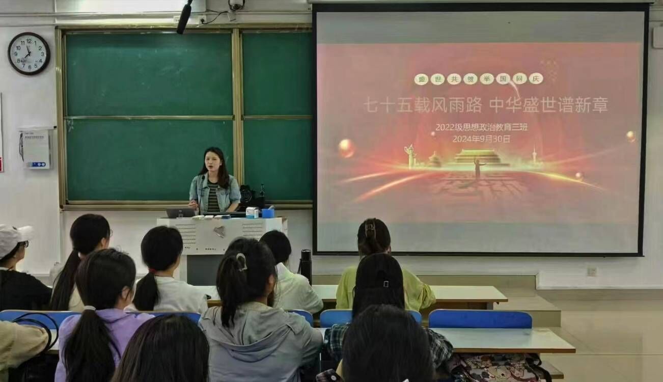为庆祝中华人民共和国成立75周年,激发员工爱国热情,凝聚青年共识,共同为实现中华民族伟大复兴的中国梦而努力奋斗,9月30日上午,2022级思想政治教育三班在社科楼514教室召开“七十五载风雨路,中华盛世谱新章”主题团课。公司2022级思想政政治教育三班班主任任婷与全体成员共同参与此次团课。团课由团支书余浩洋主持。