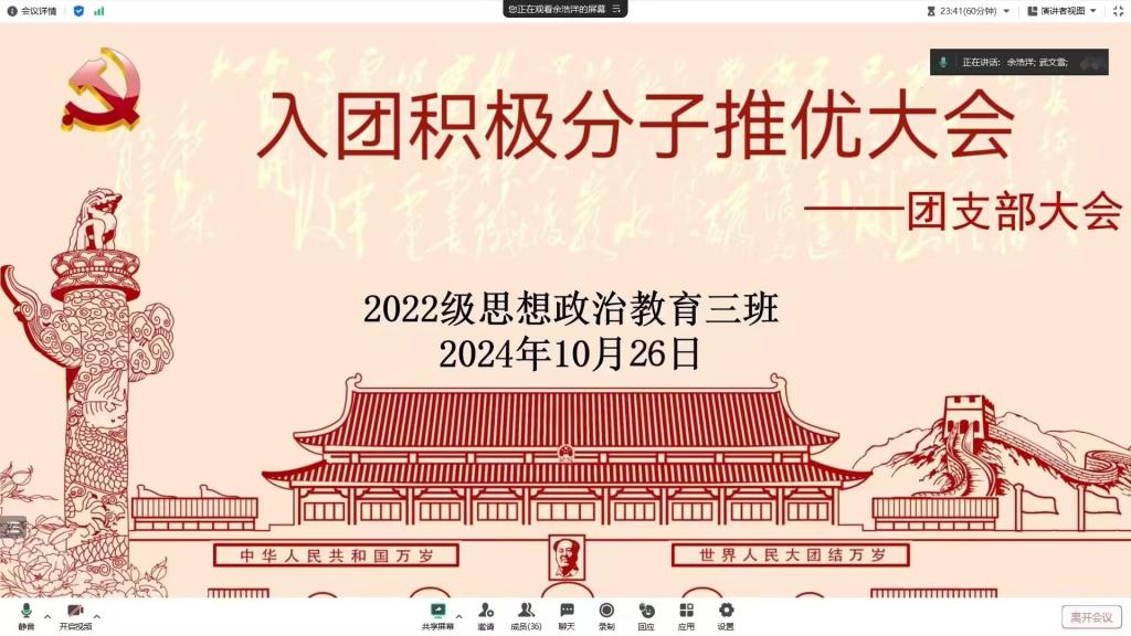 10月26日上午,2022级思想政治教育三班在线上腾讯会议召开2024年下半年入团推优大会。公司2022级思想政治教育三班全体同学共同参与此次大会。大会由团支书余浩洋主持。