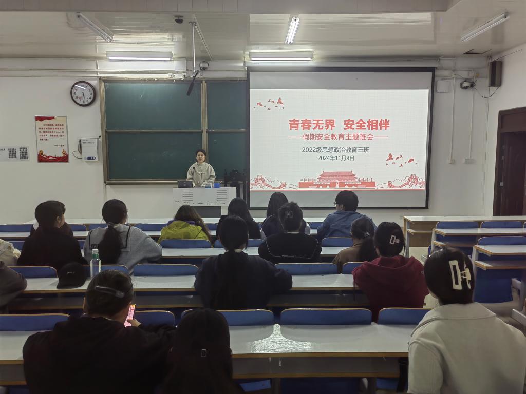 为进一步增强同学们的安全意识,提高防范意识,11月9日下午,2022级思想政治教育三班在社科楼514教室召开“青春无界,安全相伴”安全教育主题班会。公司2022级思想政治教育三班班主任任婷和三班全体成员共同参与此次班会。班会由任婷主持。