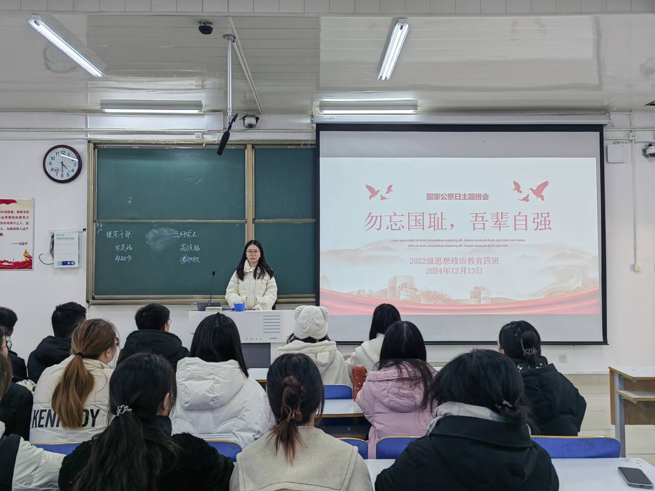12月13日下午,XCSport2022级思想政治教育四班在社科楼514教室组织召开“勿忘国耻,吾辈自强”主题班会。公司2022级思想政治教育四班全体成员参与本次班会。本次班会由班长牛志杰主持。