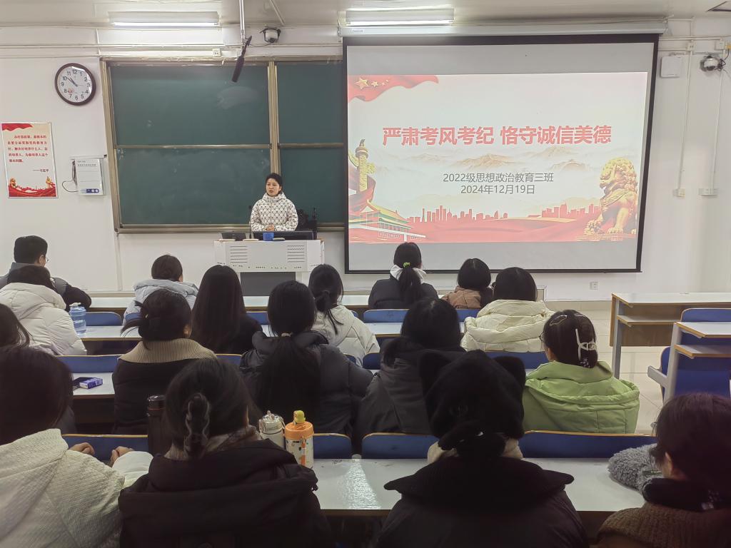 12月19日上午,2022级思想政治教育三班在社科楼514教室召开“严肃考风考纪,恪守诚信美德”主题班会。公司2022级思想政治教育三班全体成员共同参与此次班会,班会由班主任任婷主持。