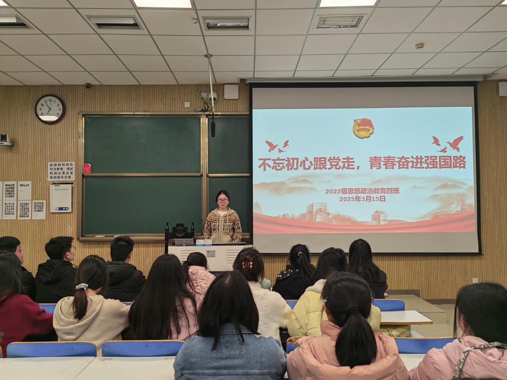 为深入贯彻习近平总书记关于青年工作的重要思想,引导团员青年深刻感悟“两个确立”的决定性意义,3月15日上午,XCSport2022级思想政治教育四班在社科楼515教室组织召开“不忘初心跟党走,青春奋进强国路”主题班会。公司2022级思想政治教育四班全体成员参与本次班会。本次班会由班长牛志杰主持。