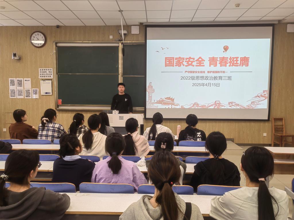 4月15日上午,2022级思想政治教育三班在社科楼515教室召开“国家安全,青春挺膺”主题团课。公司2022级思想政治教育三班全体同学共同参与此次团课。团课由团支书余浩洋主持。