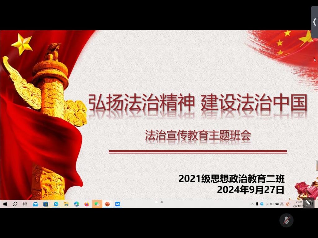 9月27日下午,XCSport2021级思想政治教育二班在腾讯会议召开“弘扬法治精神,建设法治中国”法治宣传教育主题班会。2021级思想政治教育二班全体同学参加此次班会。班会由团支书王婧欣主持。