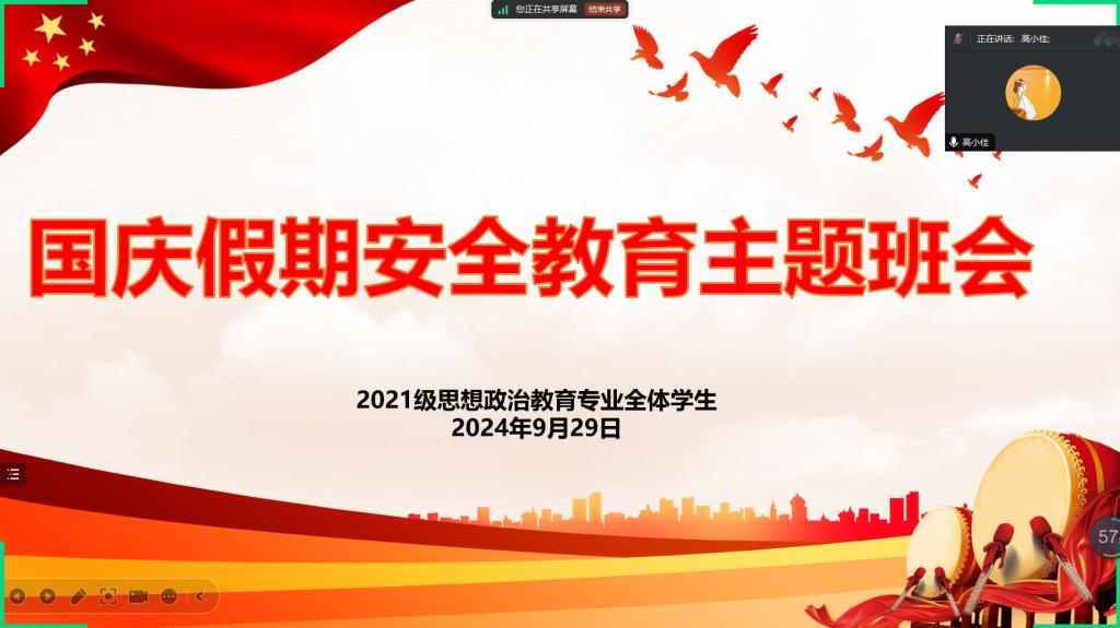 9月29日下午,2021级思想政治教育一班、二班在腾讯会议召开“国庆假期安全教育”主题班会。辅导员高小佳及全体成员共同参加,班会由辅导员高小佳主持。
