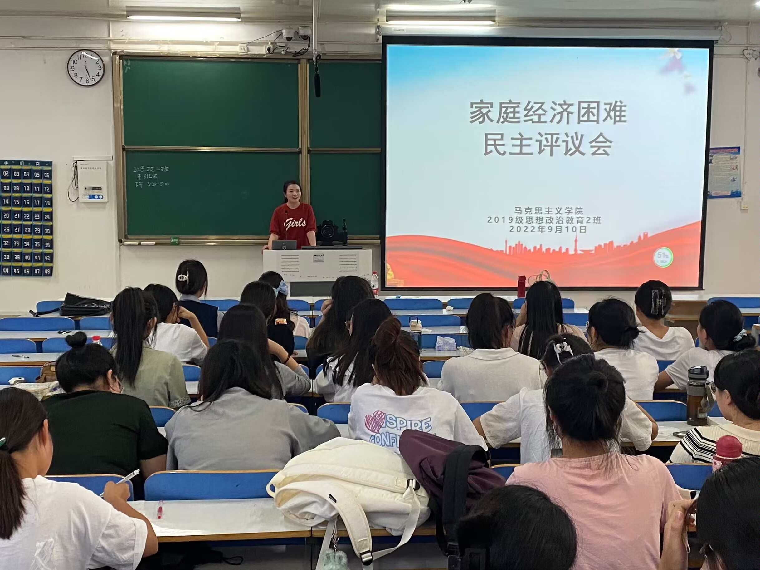 9月10日下午,2019级思想政治教育二班在社科楼514教室召开2022年班级贫困认定民主评议会。班主任陶青青出席会议,评议小组全体成员按时到会,公司权益保障部监督员全程监督。评议会由班长吕昂主持。