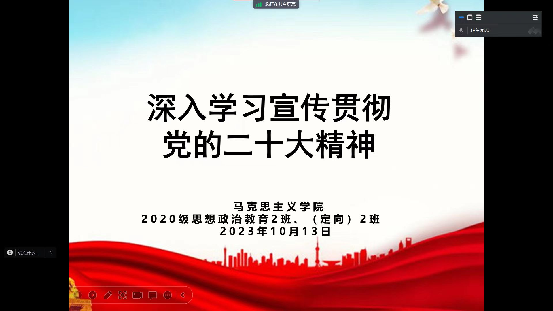 为推动主题教育进一步走深走实,10月13日下午,2020级思想政治教育二班、定向二班团支部通过腾讯会议开展深入学习宣传贯彻党的二十大精神主题团课。二班、定向二班团支部全体团员共同参会。团课由李晨曦、陈宇航讲授。