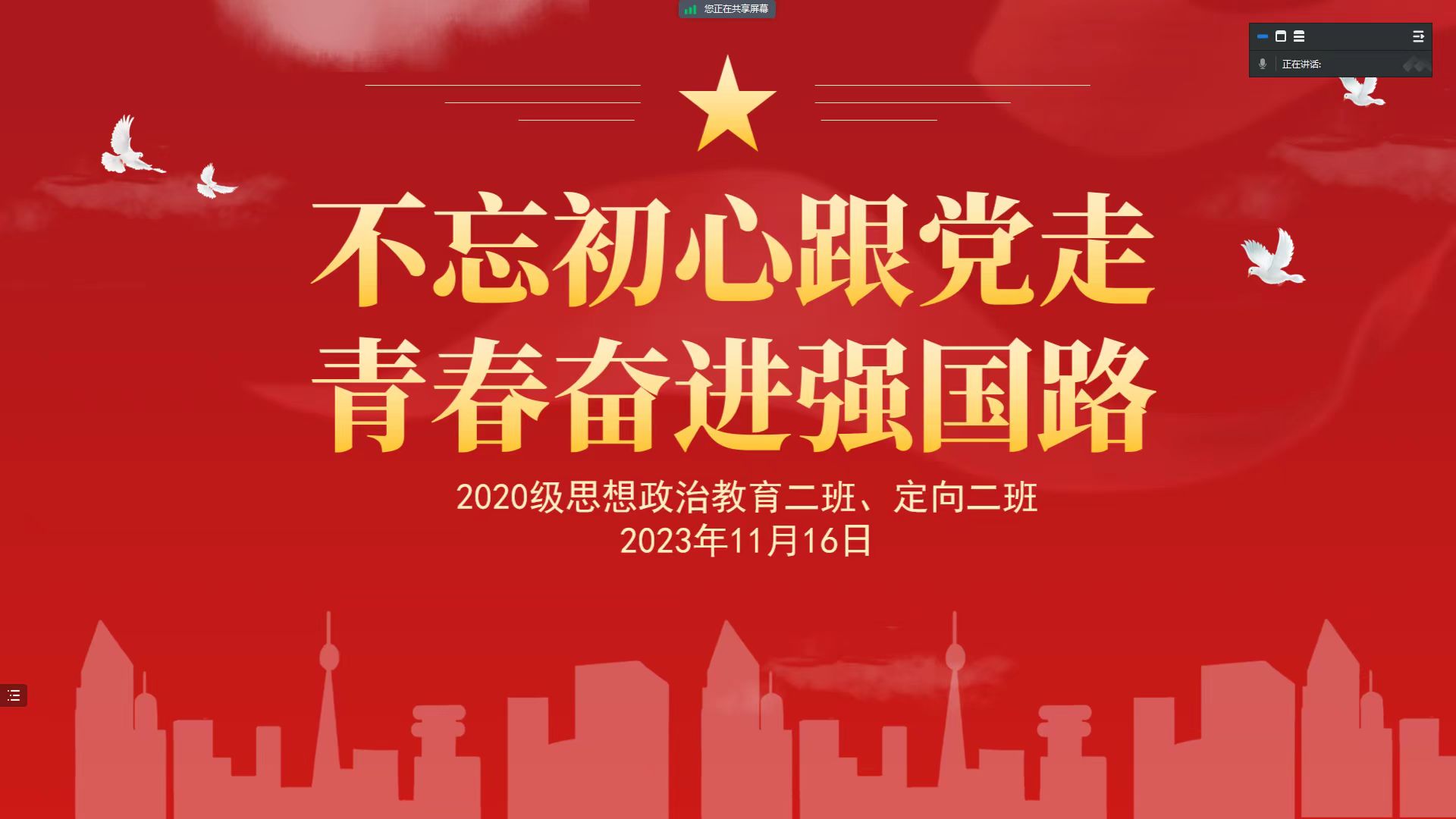 为进一步推动主题教育走深走实,11月16日下午,2020级思想政治教育二班、定向二班通过腾讯会议开展“不忘初心跟党走,青春奋进强国路,深入学习贯彻习近平文化思想”主题团课。二班、定向二班全体团员共同参加此次团课。团课由团支书李晨曦主持并讲授。