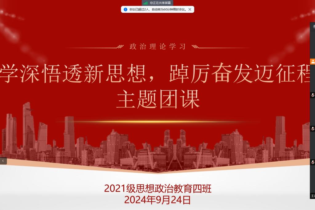 9月24日上午,2021级思想政治教育四班在腾讯会议开展“学深悟透新思想,踔厉奋发迈征程”主题团课。2021级思想政治教育四班全体员工共同参加本次团课。团课由团支书刘珂含主持。