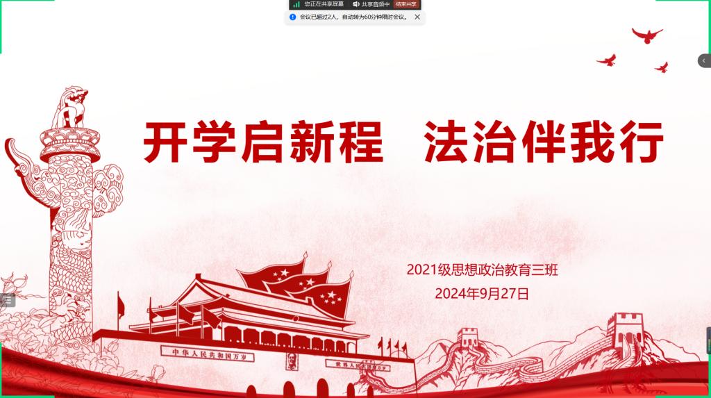 9月27上午,2021级思想政治教育三班在线上召开“开学启新程,法治伴我行”主题班会。2021级思想政治教育三班全体成员参与此次会议。会议由副班长易从漫主持。