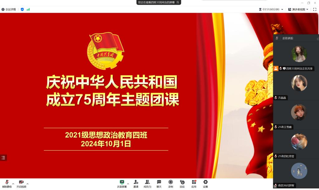 10月1日上午,2021级思想政治教育四班在腾讯会议开展“庆祝中华人民共和国成立75周年”主题团课。2021级思想政治教育四班全体同学参加本次团课。团课由团支书刘珂含主持。
